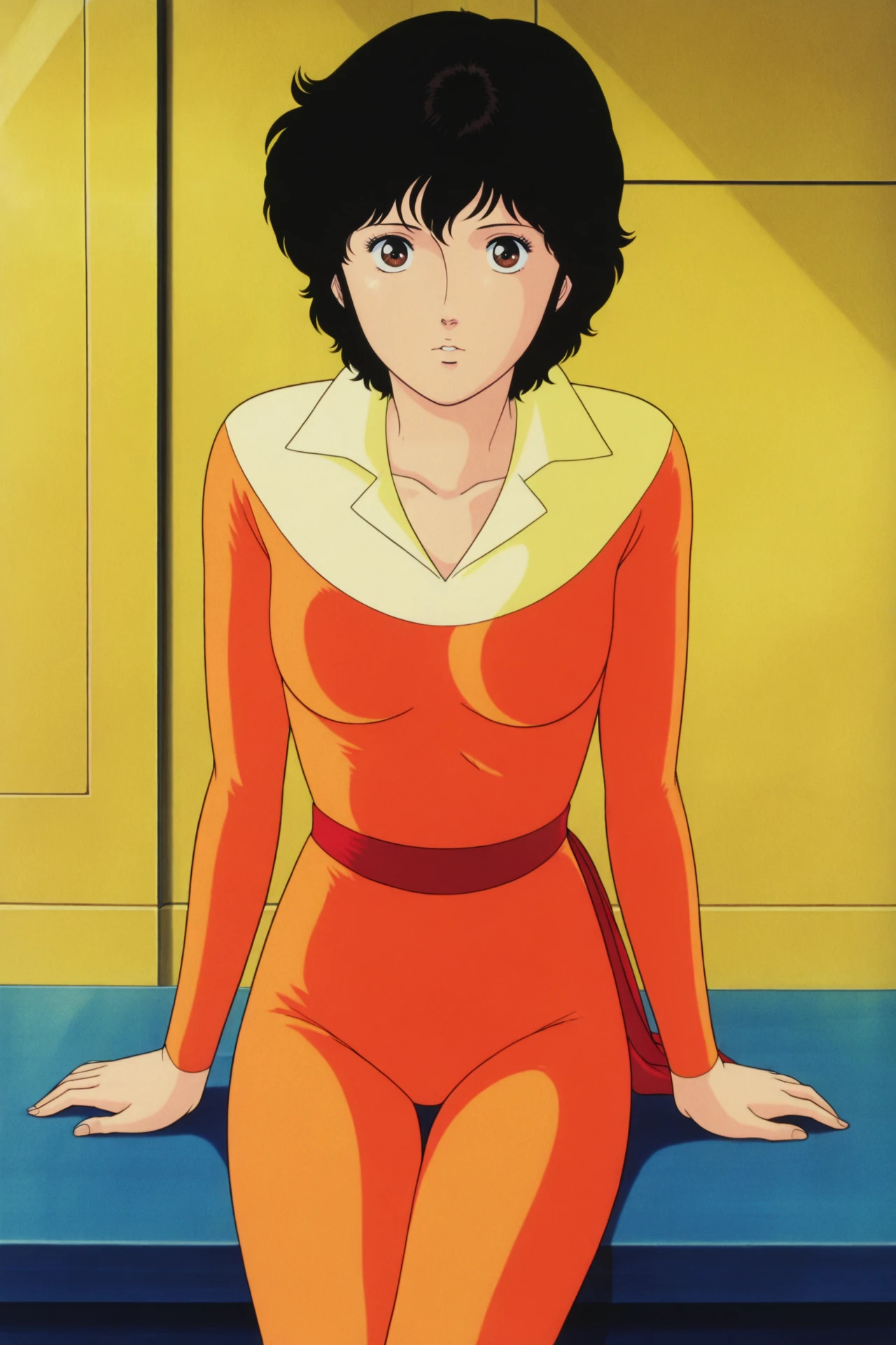 Anime woman in orange outfit sitting on a counter with her hands on her hips