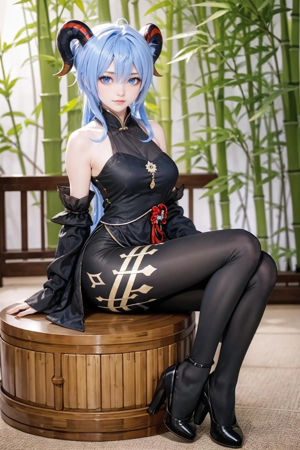 {{masterpiece, best quality, extremely detailed CG, unity 8k wallpaper, cinematic lighting, lens flare}},blue hair,ganyu \(genshin impact\),(goat horns:1.2),ganyu french maid,hair between eyes,pantyhose,(looking at viewer:1.2),blue eyes,(bamboo forest:1.3),black dress,wide view,full body,sitting,cosplay,thick body,ganyu,chinese clothes,long blond hair,green eyes,stone path,onsen,<lora:qipaoganyu_20230728182043:0.7>,detached sleeves,