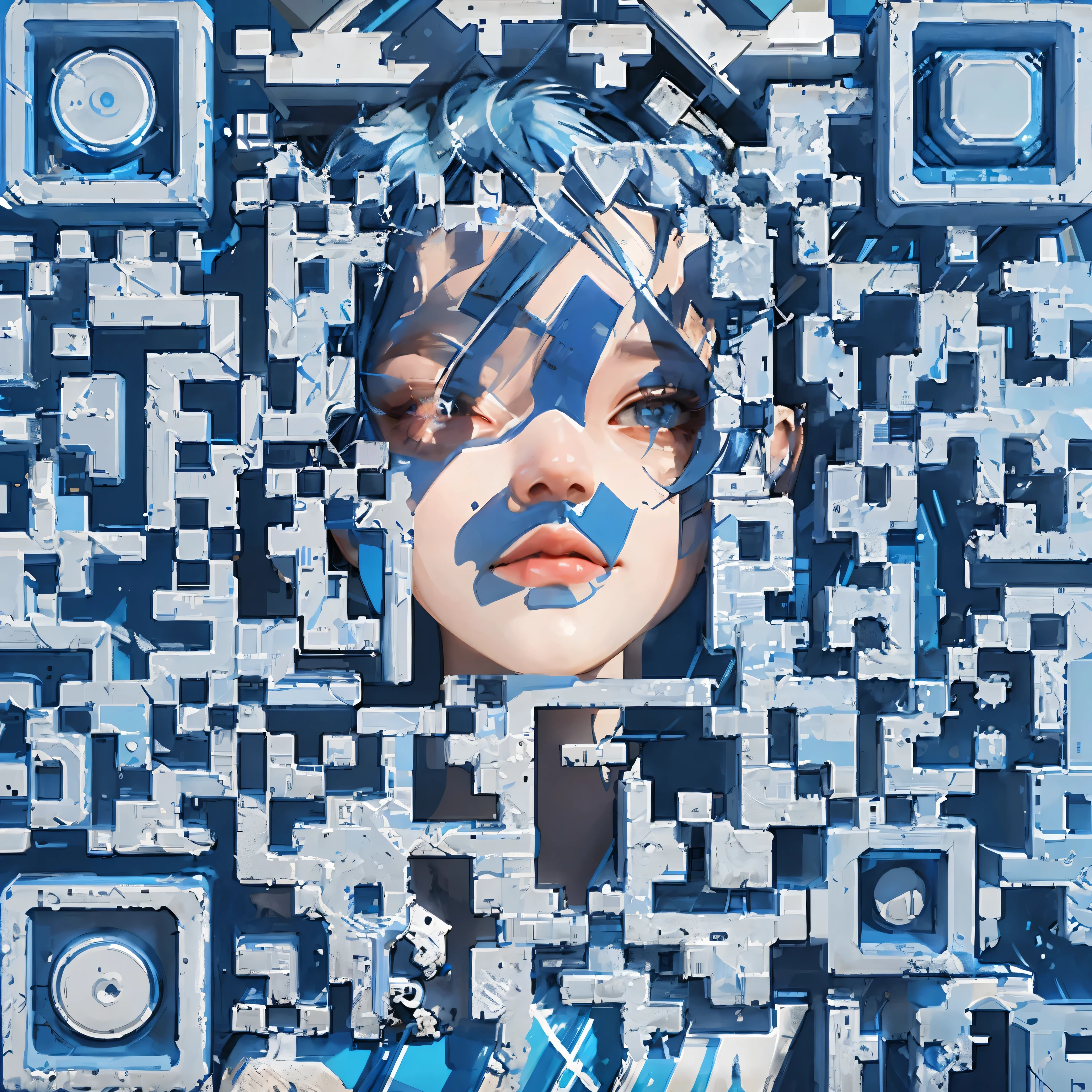 A close up of a woman with a blue face and a qr code