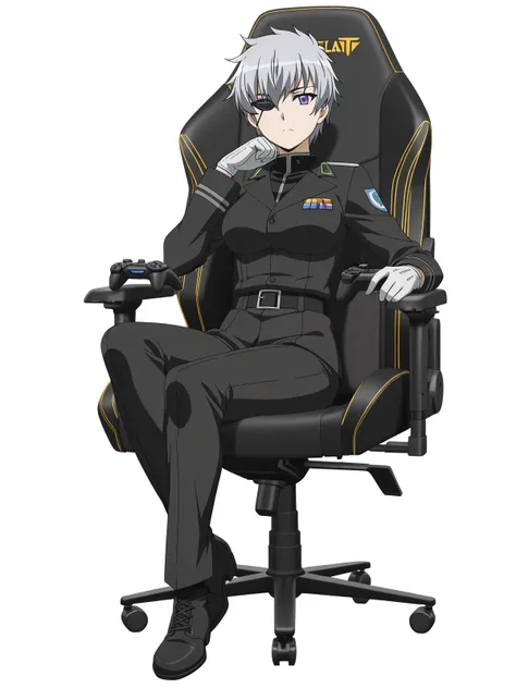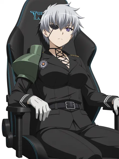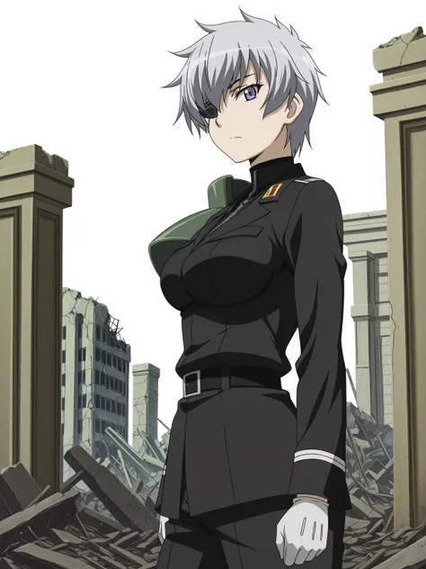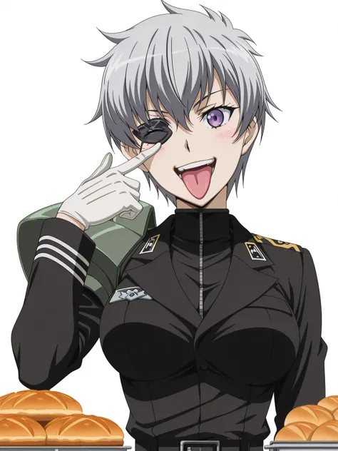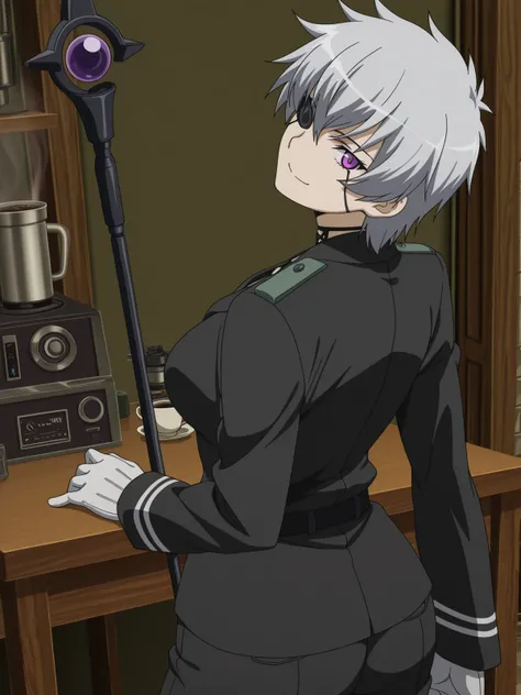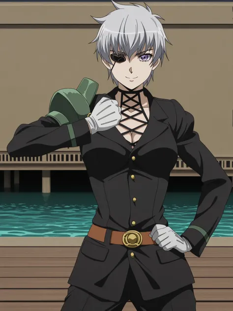 najenda, short hair, purple eyes, grey hair, eyepatch, mature female, medium breasts, anime screencapgloves, belt, white gloves, uniform, military, military uniform,