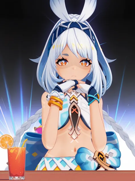 <lora:gendou-pose-illustriousxl-lora-nochekaiser:1>, gendou pose, own hands clasped, own hands together, parody, shaded face, looking at viewer, frown, elbow rest,