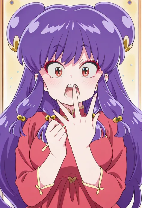 shampoo, shampoo (ranma 1/2), long hair, hair ornament, red eyes, purple hair, hair bun, double bun, mature female, medium breasts, anime screencap,dress, chinese clothes, china dress, red dress, long sleeves,