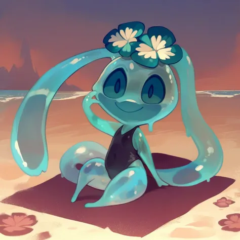 Cress(FV),1girl, semi-anthro, slime girl, blue body, Translucent body, tail, long ears, dark blue eyes, flower head ornament,