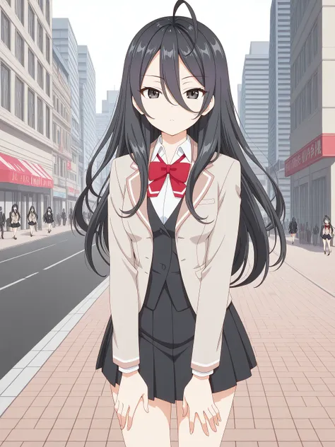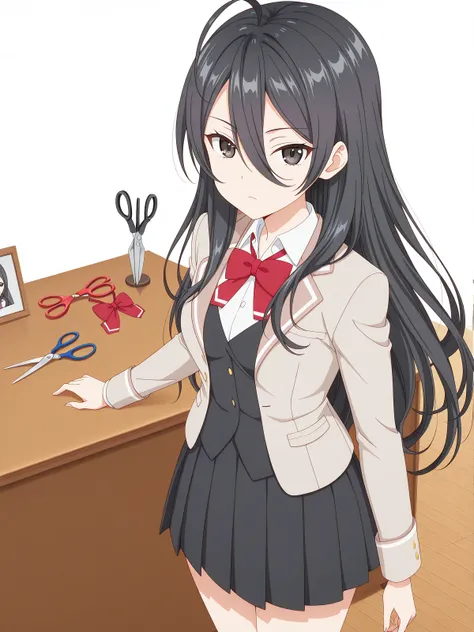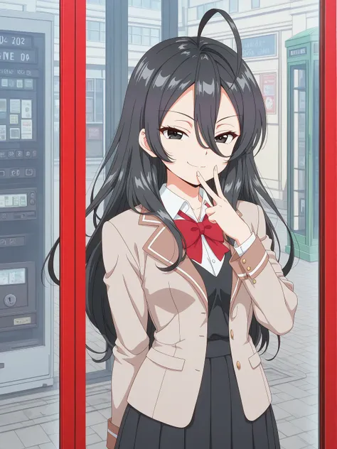 ayano kimishima, black hair, black eyes, ahoge, long hair, hair between eyes, mature female, small breasts, anime screencapshirt, bow, jacket, white shirt, collared shirt, bowtie, red bow, blazer, red bowtie, black skirt, pleated skirt,