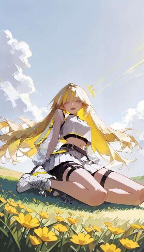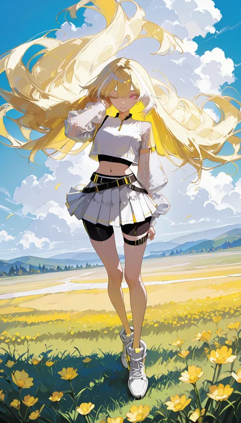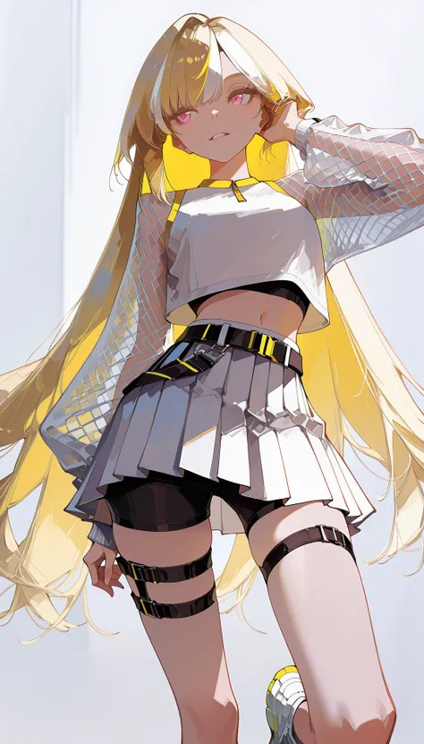AeroStriker, 1girl,blonde hair, multicolored hair, white highlighted hair, pink eyes, white crop top, mesh sleeves, tennis skirt, white skirt,belt, tight black shorts under skirt,white high-top sneakers, thigh straps, mesh clothing, midriff, exposed navel,