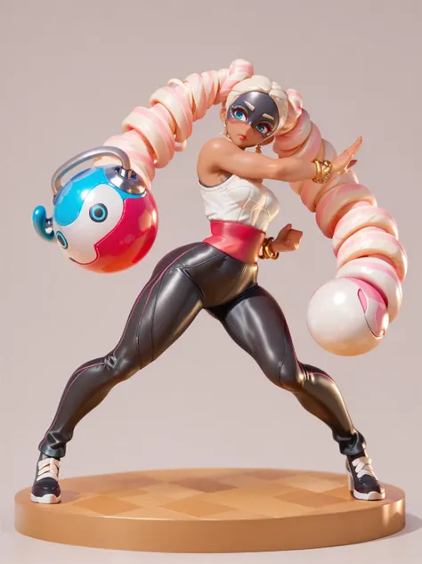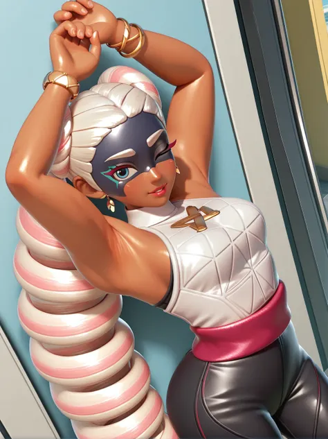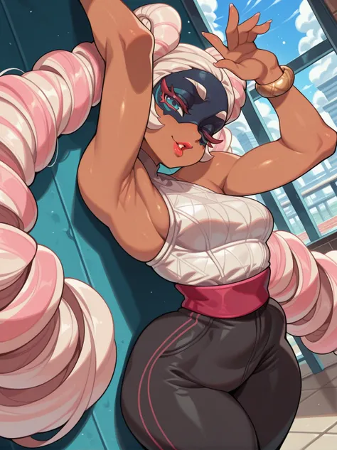 TwintelleXL,,dark-skinned female, long hair, twin drills, mask, drill hair, multicolored hair, pink hair, blonde hair, lipstick,,shirt, black pants, sleeveless, bracelet, jewelry, red sash, backless top,,official style, screencap, 3d,,