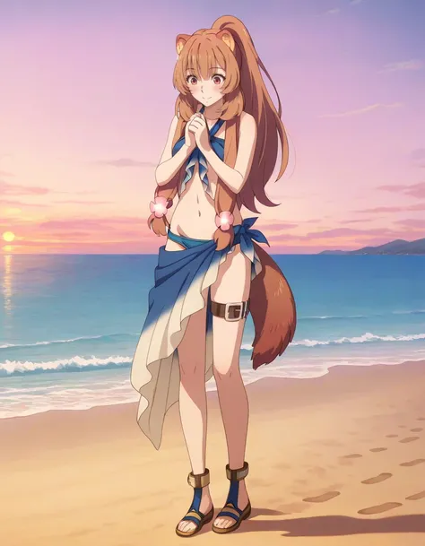 <lora:raphtalia-tate_no_yuusha_no_nariagari_s2-ixl-anime-soralz:1>, raphtalia (tate no yuusha no nariagari), long hair, animal ears, brown hair, red eyes, sidelocks, hair tubes, tailcasual outfit, white blouse, high collar, neck ribbon, long sleeves, cross-laced cutout, red tunic, frilled skirt, layered skirt, leather boots, thigh bootscombat outfit, white blouse, high collar, neck ribbon, leather armor, leather vest, long sleeves, metal wrist cuffs, leather gloves, cross-laced cutout, red tunic, belt, frilled skirt, layered skirt, leather boots, thigh bootscombat outfit 2, armor, white blouse, high collar, neck ribbon, single pauldron, breastplate, long sleeves, metal wrist cuffs, armored gloves, cross-laced cutout, red tunic, belt, frilled skirt, layered skirt, leather boots, armored boots, thigh bootsmiko outfit, japanese clothes, white kimono, ribbon, tassel, red bow, long sleeves, wide sleeves, red hakama skirt, rope, bobbles, tabi, zouriponytail, sidelocks flower hair ornament, blue swimsuit, blue bikini, navel, sarong, thigh strap, cross-laced sandals