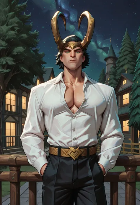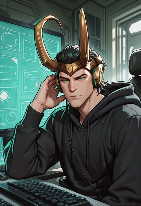 MRL0k1, 1boy, male focus, headpiece, crown, horns, green eyes, short hair, black hair
