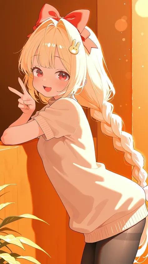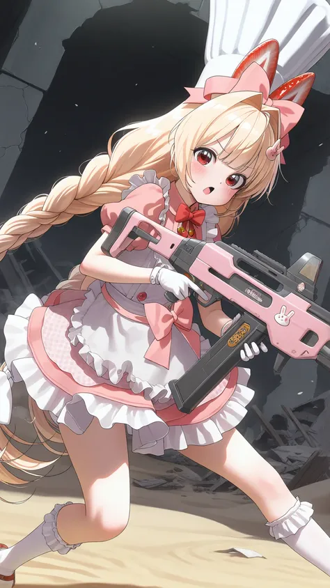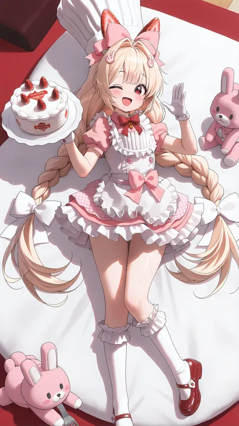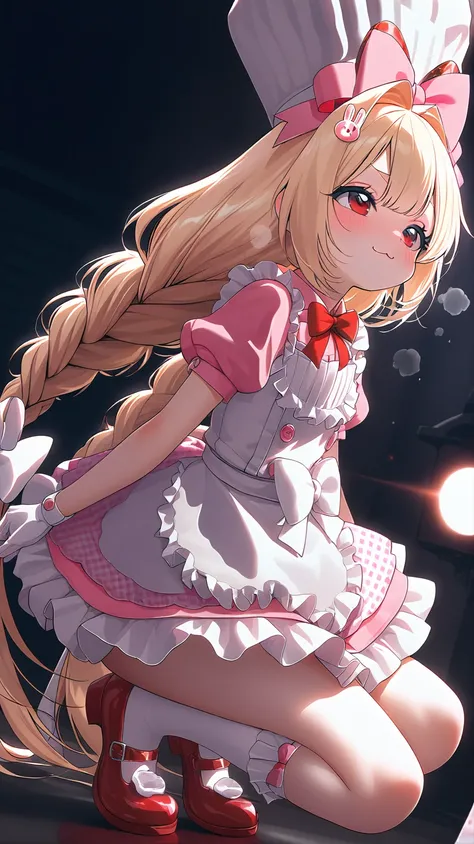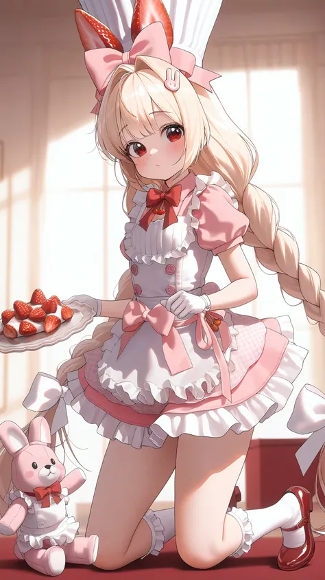 long hair, blush, bangs, blonde hair, hair ornament, red eyes, gloves, hat, dress, bow,animal ears, twintails, very long hair, braid, short sleeves, hair bow, frills, shoes, socks, puffy sleeves, white gloves, rabbit ears, apron, red bow, twin braids, puffy short sleeves, kneehighs, white headwear, frilled dress, white bow, white socks, red footwear, pink dress, white apron, frilled apron, food-themed hair ornament, rabbit hair ornament, chef hat, frilled socks,