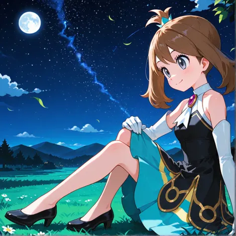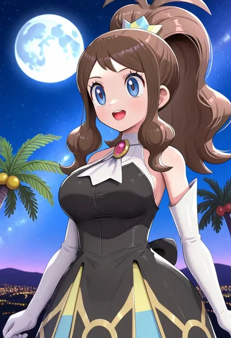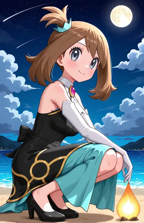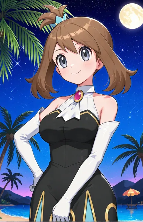 ncmay, may \(pokemon\), grey eyes, brown hair, bangs, medium hairhair ornament, halter dress, sleeveless dress, layered dress, black dress, multicolored dress, white ascot, bare shoulders, elbow gloves, white gloves, shoes, high heels, black footwear