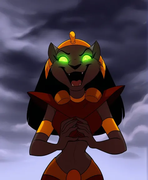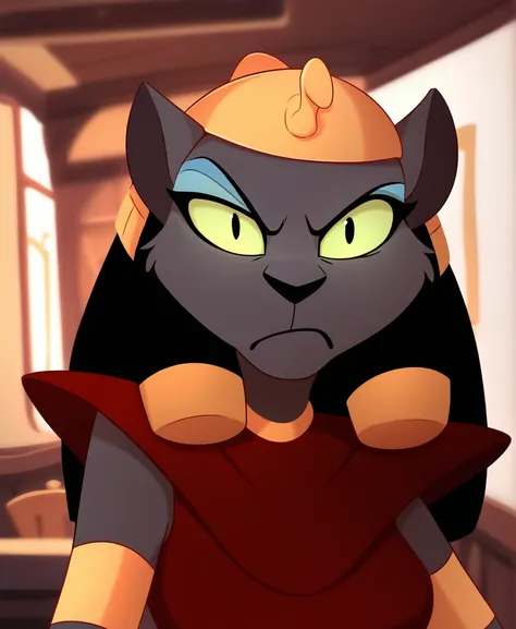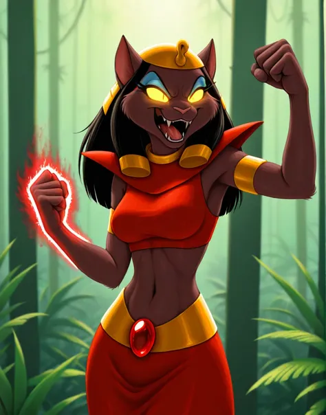mirage, female, anthro, cat, brown fur, black hair, green sclera, eyeshadowred topwear, pauldron, red skirt, gold waistband, red jewel, gold headwear