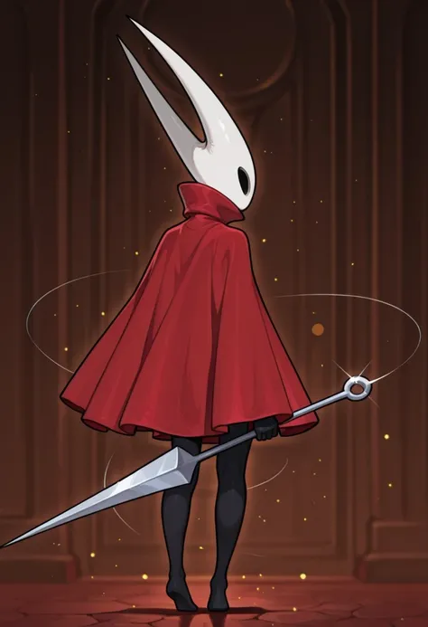 H0rn3t-HKblack skin, hollow eyes, white face, masked face, long sharp horns, no mouth,red cloak,needle sword,Colored skin, insectoid, slender female,