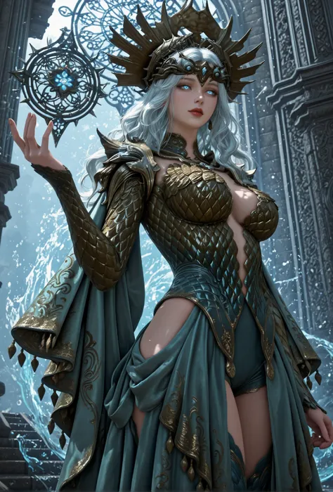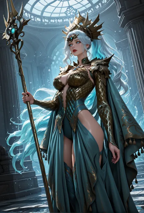 RusalkaRusalka, beautiful woman, elegant, regal, goddess-like, fair skin, flawless face, mature woman, blue eyes, glowing eyes, eyelashes, thick lips, red lips, absurdly long hair, wavy hair, silver hair, white hair, ornate golden crown, spiked crown, gemstone centerpiece, seashell motif crown, royal jewelry, gemstone necklace, ornate chokergolden armor, scale armor, metallic chestplate, cleavage cutout, large breasts, armored scale sleeves, ornate shoulder plates, flowing cape, teal cloak, long cloak, embroidered cloak, golden embroidery, tassel details, aqua-blue fabric, silky fabric, layered skirt, slit dress, thigh slit, elegant drapery, intricate hem patterns, thick thighs, wide hips, narrow waist, blue ornate thighhighsholding trident, golden trident, golden spear