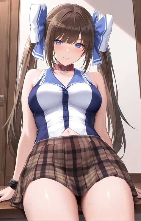 twintails, brown hair, long hair, blue eyes, hair bowwristband, collar, high heelsplaid skirt,sleeveless shirt,underwear, blue bra, blue panties,