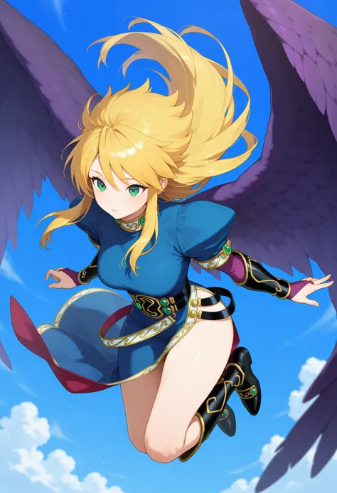 aanina, long hair, blonde hair, green eyes, feathered wings, blue dress, puffy sleeves, arm guards, bridal gauntlets, black belt, side slit