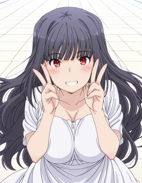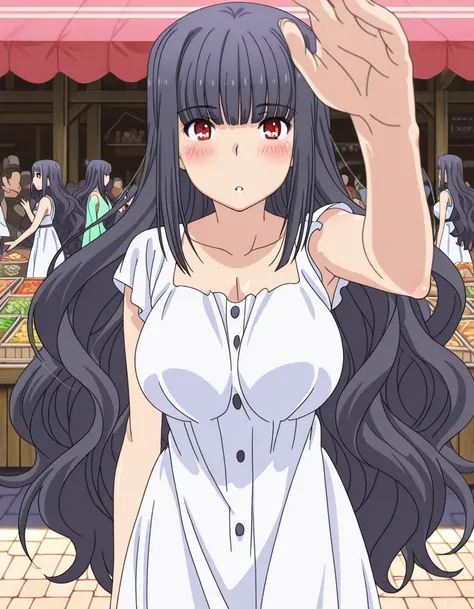 raika oda, long hair, black hair, red eyes, mature female, large breasts, anime screencapdress, collarbone, white dress, sundress,