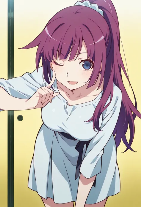 <lora:alyas-finger-to-cheek-illustriousxl-lora-nochekaiser:1>, finger to cheek, solo, looking at viewer, blush, smile, open mouth, standing, one eye closed, hand up, leaning forward, index finger raised,