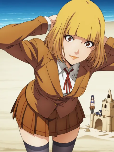 hana midorikawa, short hair, bangs, blonde hair, brown eyes, blunt bangs, mature female, small breasts, anime screencapskirt, shirt, thighhighs, black thighhighs, zettai ryouiki, blazer, brown blazer, brown skirt