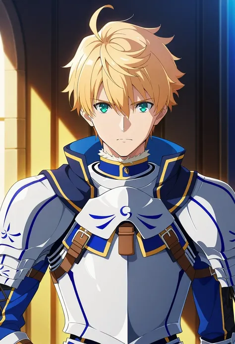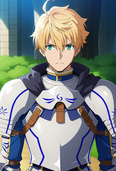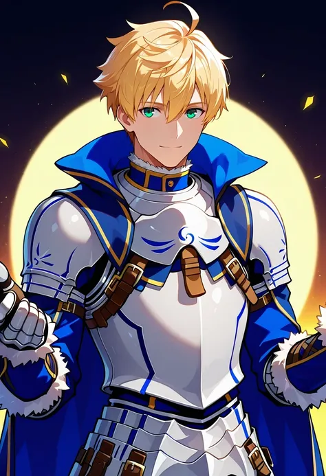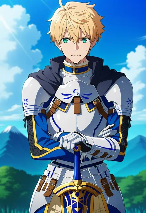 arthur_pendragon_fate, blonde hair, green eyes, short hair, ahoge, hair between eyes, bangsarmor, breastplate, gauntlets, pauldrons, shoulder armorblue capeholding sword