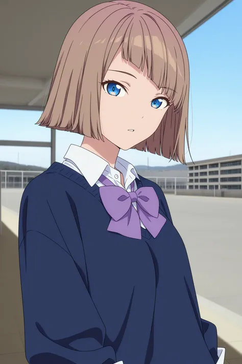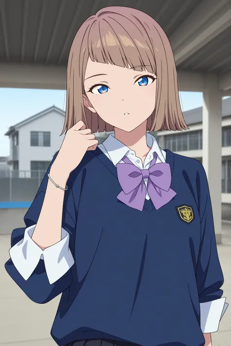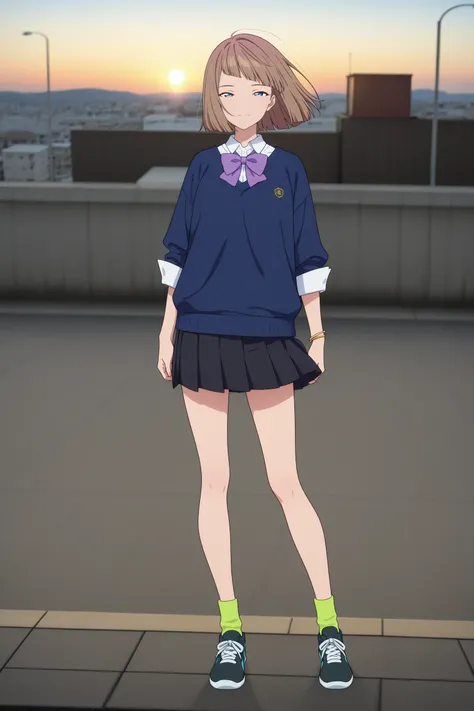 minami kano, short hair, brown hair, bob cut, diagonal bangs, blue eyes, bracelet, three-quarter sleeves, sleeve cuffs, blue sweater, white shirt, collared shirt, purple bowtie, black skirt, pleated skirt, green socks, ankle socks, sneakers