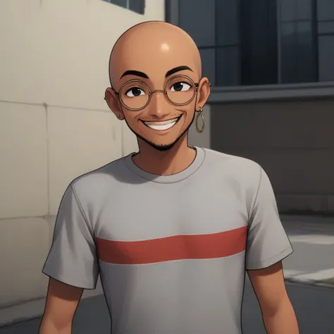 1boy,tanned skin,bald,beard stubble, black eyes,grey t-shirt with red stripe,jeans,round glasses,single earring