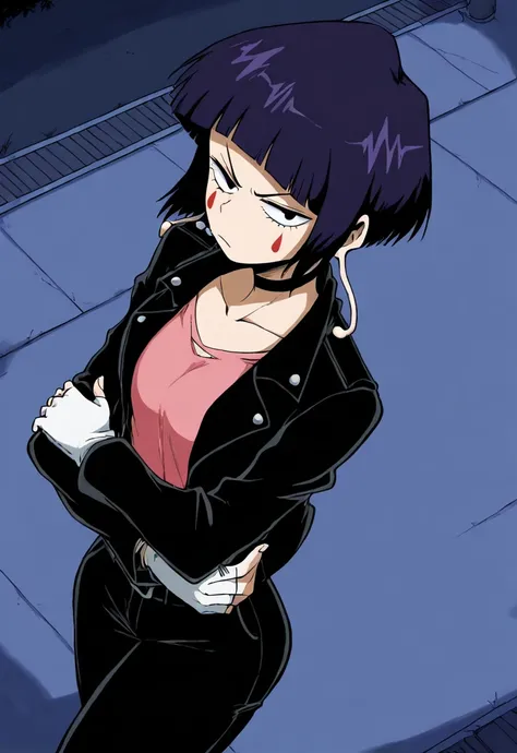 illujiro, short hair, bangs, long earlobes, purple hair, black hair, black eyes, facial mark, black jacket, collarbone, choker, white gloves, fingerless gloves, pants, pink shirtu.a. school uniform, red necktie, jacket, pleated skirt (u.a. gym uniform:1.5), short sleeves, pants,u.a. cheerleader uniform, orange crop top, orange pleated skirt, orange choker, midriff, pom pom \(cheerleading\)