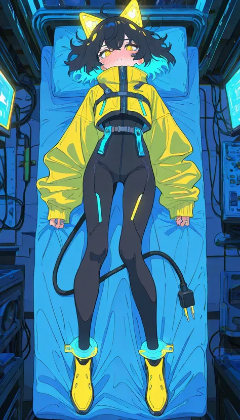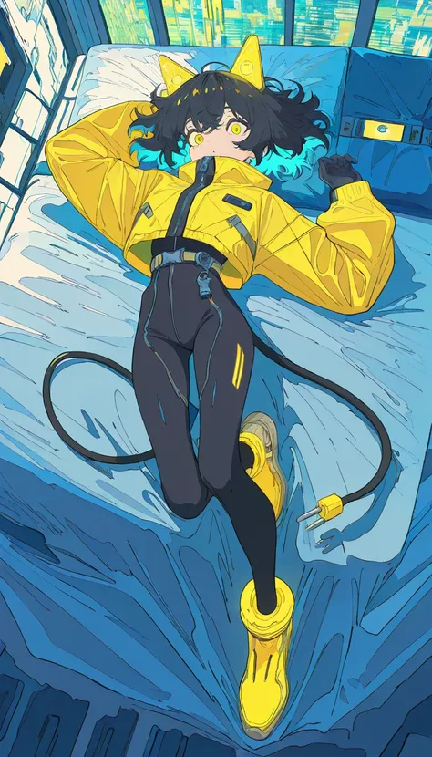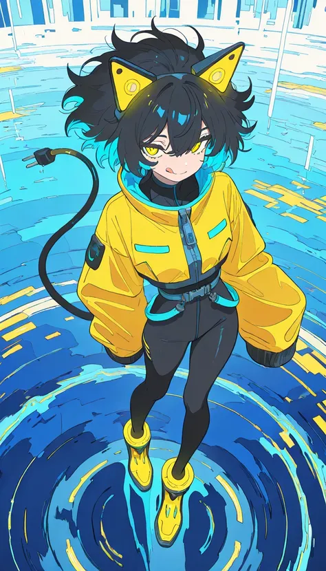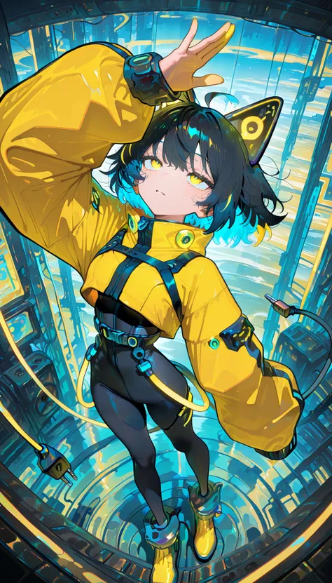 electrocat, 1girl,black hair, short hair,blue ahoge, multicolored hair, yellow highlights, blue highlights, cat ears, cyber ears, glowing accents, yellow eyes, yellow jacket, oversized sleeves, cropped jacket, black bodysuit, skin-tight, high-waist belt, utility straps, harness, futuristic boots, yellow boots, black and yellow shoes, ankle cuffs, electric plug tail,