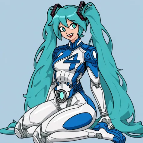 Suestorin, complete bodysuit,4 symbol in chest right side, white tactical suit, suit with blue accents,long sleeves,white and blue tactical gloves, high-tech fabric texture, utility belt with silver buckle, kneecaps, white and blue armored boots,reinforced toe cap,