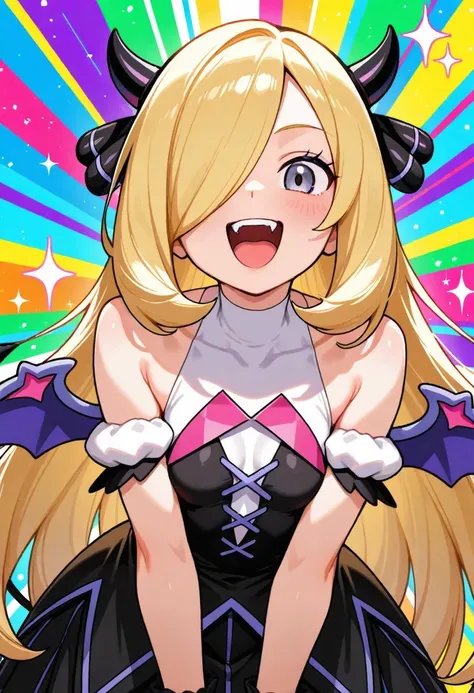 falliris, aged up, iris \(pokemon\), red eyes, purple hair, long hair, hair rings, twintails, dark-skinned femalefake horns, halter dress, multicolored dress, white halterneck, bare shoulders, detached sleeves, short sleeves, wrist cuffs, fake wings, fake tail, black socks, shoes, mary janes, pink footwear