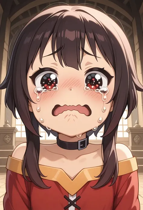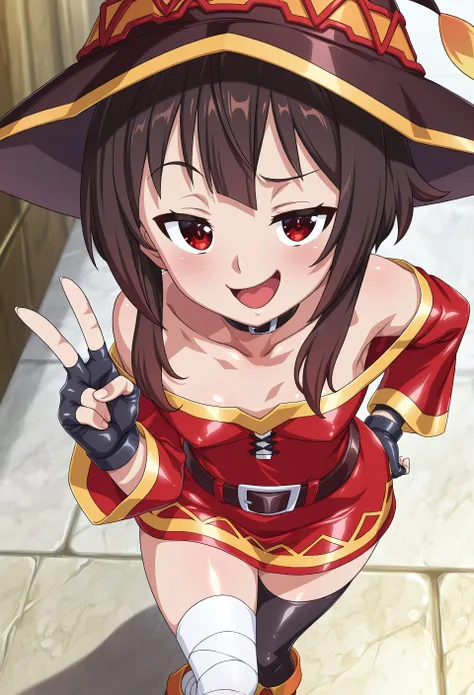 Megumin-Liver0201girl, solo, short hair, brown hair, black hair, short hair with long locks, red eyes, red dress, short dress, witch hat, cape, black cape, brown cape, gloves, black gloves, fingerless gloves, thighhighs , black thighhighs, asymmetrical legwear, single thighhigh, boots, black belt, brown belt, belt buckle, choker, black choker, collar, bandages, bandaged leg, staff, holding staff, bare shoulders, long sleeves, collarbone, mismatched legwear, brown footwear, orange footwear, black headwear, brown headwear, zettai ryouiki, off shoulder, off-shoulder dress