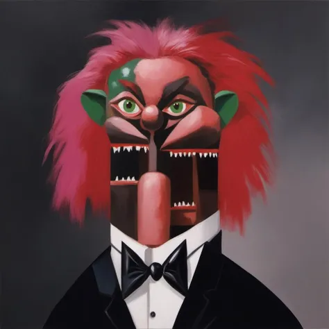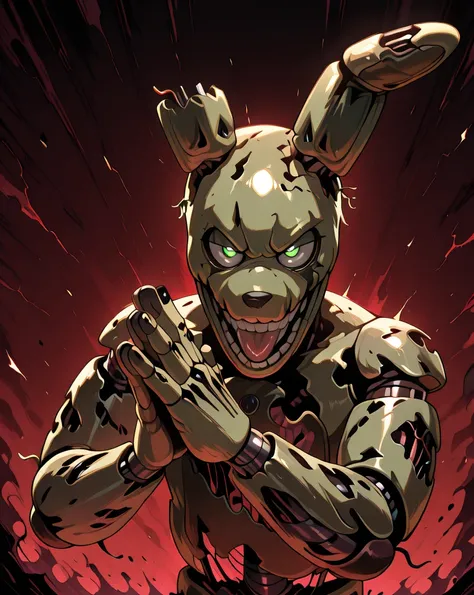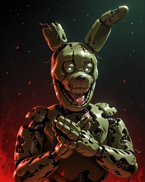 springtrap, no humans, robot, animal ears, teeth, damaged, mechanical parts, joints, circular head, round head, glowing white pupils, dark green eyelids,