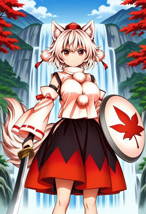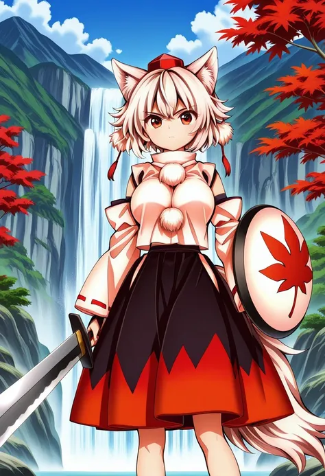 inubashiri momiji, 1girl, solo, red eyes, white hair, short hair, wolf ears, wolf tail,tokin hat, detached sleeves, white shirt, black skirt, two-tone skirt,holding sword, holding shield,