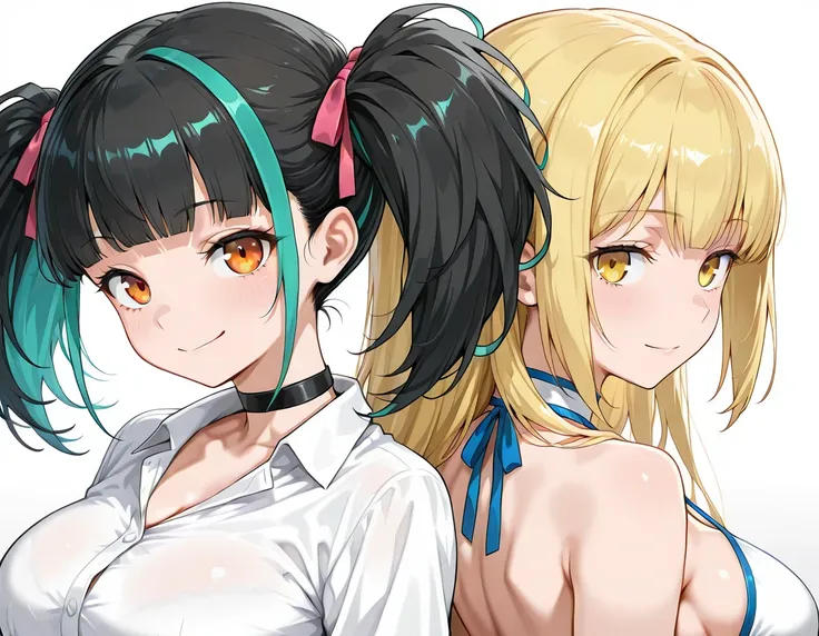 PadMenoa,(general),1girl,multicolored hair,black hair, green streaked hair,orange eyes,blunt bangs,twintails, hair ornaments,white jacket,open jacket, fingerless pink gloves,bracelet,showgirl skirt,,two-tone thighhighs, white boots,PadMenoaChristmas,(general),1girl, multicolored hair,lightgreen hair,red streaked hair,blunt bangs,twintails, star hair ornament,fur-trimmed hair ornaments, orange eyes, neck bell, red coat,open jacket,red gloves,red showgirl skirt,white thighhighs,PadMenoaSchool,(general),1girl,multicolored hair,black hair, green streaked hair,blunt bangs,twintails, hair ribbon, orange eyes,black choker,pink ribbon,white shirt,wristband,navel,black panty straps, blue pleated skirt, white thighhighs,