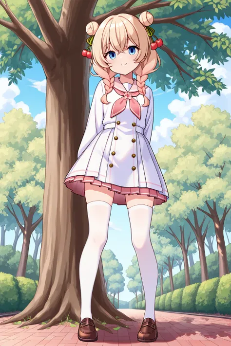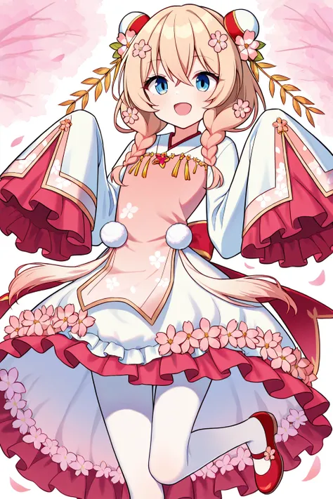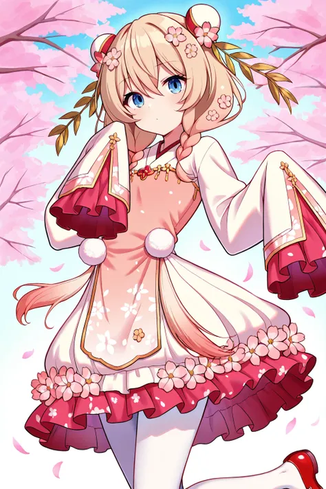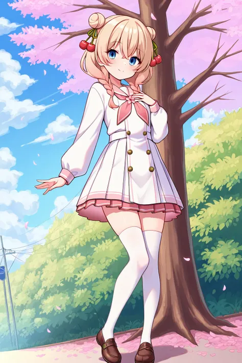 asumi shuo, outfit1, bangs, braid,hair between eyes, hair bun, hair ornament, hair over shoulder, hair ribbon, double bun,twin braids,cherry hair ornament, blonde hair, blue eyes, brown footwear,loafers,shoes, thighhighs,white thighhighs, dress, long sleeves, neckerchief, pink neckerchief, pink sailor collar, pleated dress, puffy long sleeves, puffy sleeves, ribbon, sailor collar, school uniform, serafuku, white dress,asumi shuo, outfit2, bangs, blonde hair,braid,hair between eyes, hair bun, hair flower, hair ornament,twin braids, bun cover, double bun, blue eyes, dress, frills, long sleeves, pantyhose, pink dress, pink flower, pom pom (clothes), red footwear, shoes, sleeves past fingers, sleeves past wrists, white dress, white leggings, white pantyhose, wide sleeves,