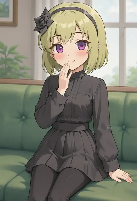 olive hair, short hair, purple eyes, black headband,black dress, long sleeves, high neck, pleated skirt, black leggings,NinonBeart.black boots