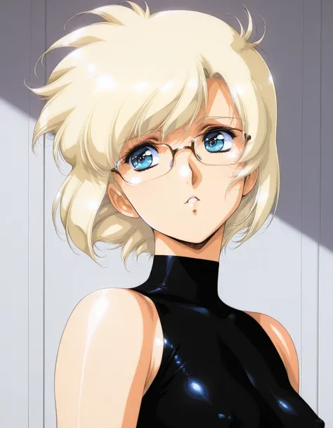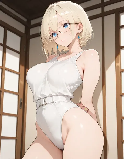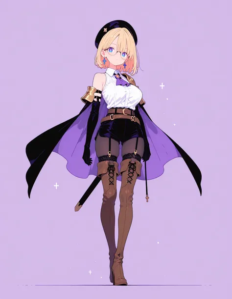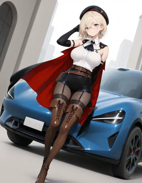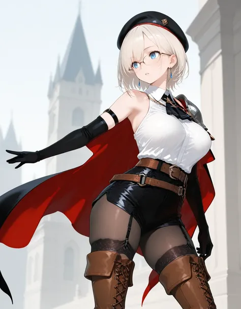mai_lydia,short_hair,blonde_hair,blue_eyes,large_breasts,glassesdangle_earrings,beret,black_headwear,bare_shoulders,sleeveless_shirt,collared_shirt,white_shirt,ascot,elbow_gloves,black_gloves,arm_strap,brown_belt,black_shorts,shoulder_armor,garter_straps,black_pantyhose,thigh_boots,high_heel_boots,cross-laced_footwear,brown_footwear,black_cape,red color inner cape