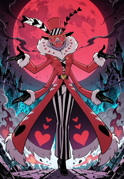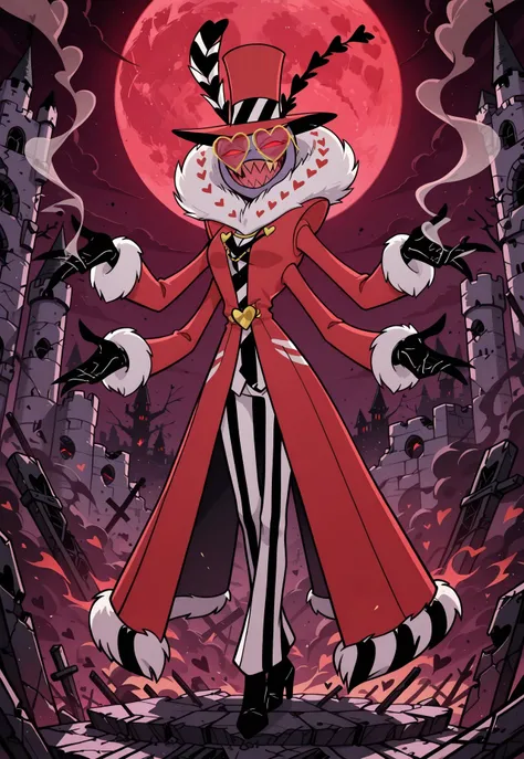 valentino_hh, purple skin, four arms, red eyes, sharp teeth, long fingers, sharp fingers, moth demon, fur collar with heart accents, red top hat,black gloves, heart-shaped glasses, gold glasses,long red coat, closed coat, fluffy white trim, black and white striped lining, black high heels,dark gray shirt, open-front shirt, rolled-up sleeves, dark gray belt with gold heart buckle, white pants, gold sharp talons, black high heels,