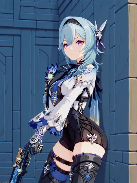 eula, eula (genshin impact), bangs, hair ornament, hair between eyes, blue hair, purple eyes, sidelocks, hairband, medium hair, black hairband, mature female, breasts, 3d,thighhighs, gloves, long sleeves, necktie, black gloves, cape, leotard, blue necktie, vision (genshin impact),