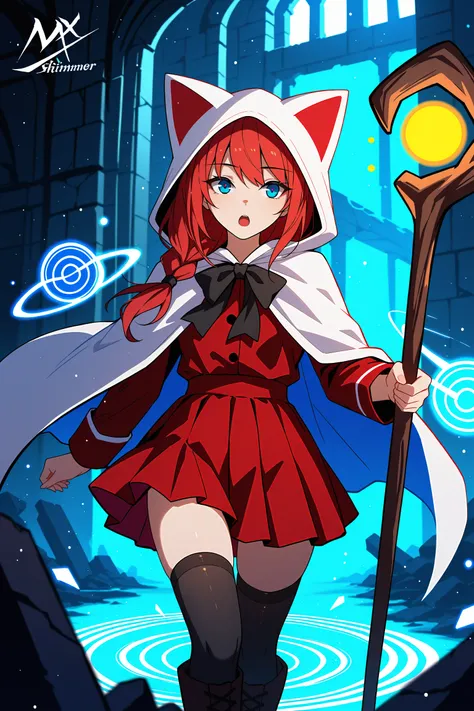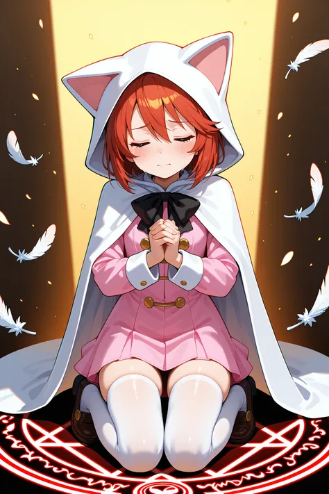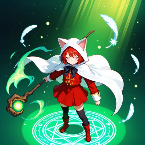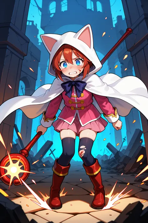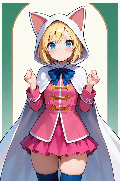 devout_cos,cat hood,animal hood,white_cape,chest bow,gold buttonspink jacket, pink skirt,pink dress,red jacket,red skirt,red dress,thighhighs,staff,holding staff,