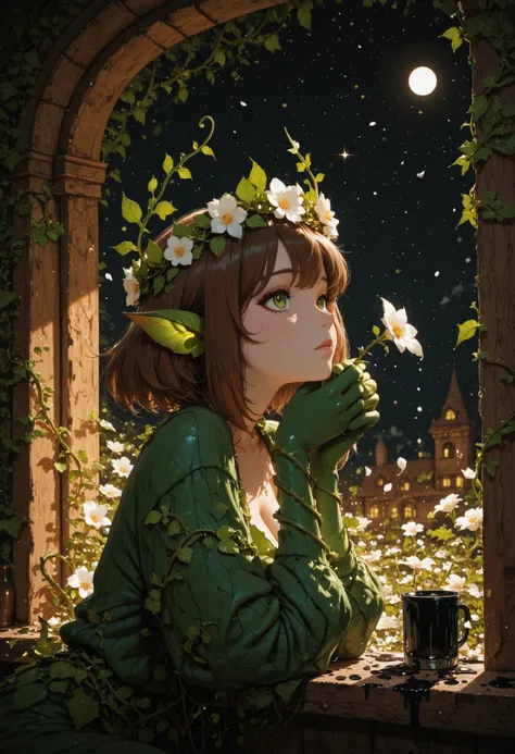 dryad, flower_crown, leaf_outfit, ivy_gloves, short_brown_hair, leaf_ears green_eyes,