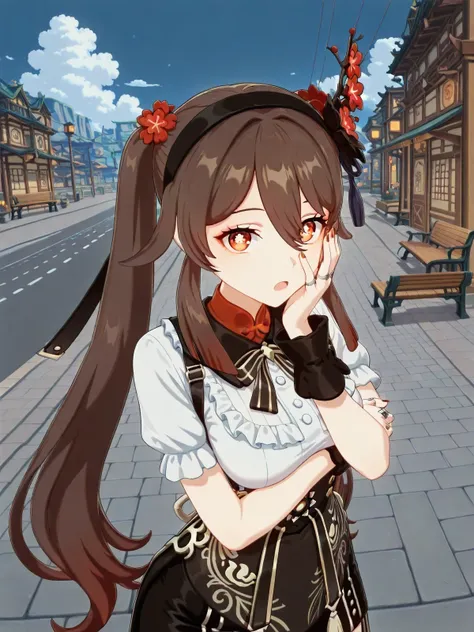 <lora:dagashi-kashi-s1-key-visual-illustriousxl-lora-nochekaiser:1>, dagashi kashi, solo, looking at viewer, open mouth, skirt, hair ornament, bow, flower, short sleeves, outdoors, frills, hairband, sky, day, cloud, bowtie, hair flower, nail polish, wrist cuffs, rose, suspenders, red nails, hand on own face, high-waist skirt, breast hold, hand on own cheek, suspender skirt, ringed eyes, road, bench, black flower, sidewalk,