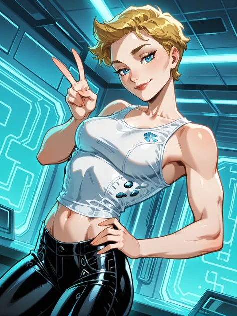 FragilXL,,blue eyes, blonde hair, short hair, bodysuit, long sleeves,,official style, screencap, realistic
