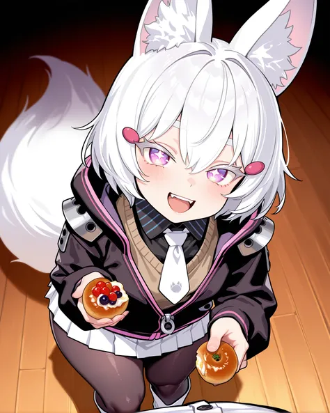 MaEnma, fox girl, short hair, white hair, fox ears, fox tail, white colored eyelashes, purple eyes, hair ornament, black shirt collar, white necktie, brown sweater, white skirt, black pantyhose, pink trim, white boots, black jackets, partially unzipped jacket, hood down, large zipper pull tab, metal shoulder pads,long sleeves sweater,ShriEma, fox girl, fox ears, hair hair between eyes, high ponytail, fox tail, 9 tails, miko, tassels, long wide sleeves, red skirt, red hakama, sandals, white socks,