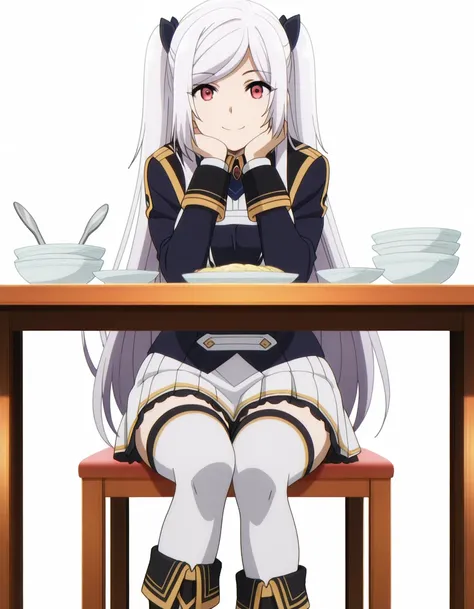alexia midgar, long hair, very long hair, hair ribbon, white hair, red eyes, sidelocks, ribbon, mature female, medium breasts, anime screencapskirt, thighhighs, long sleeves,pleated skirt, boots, miniskirt, black footwear, white thighhighs, zettai ryouiki, white skirt,
