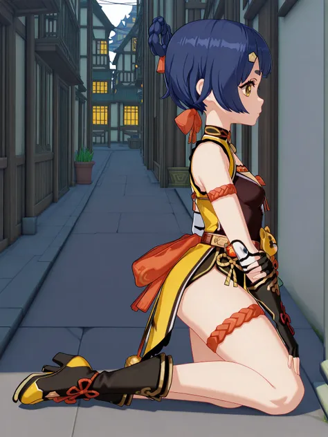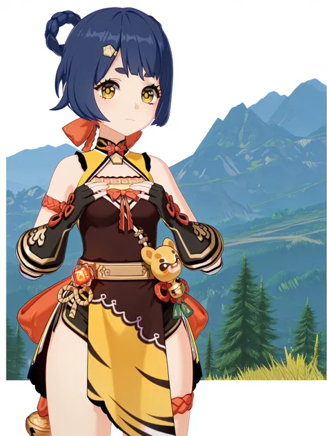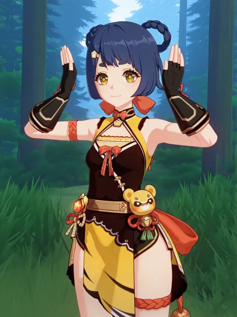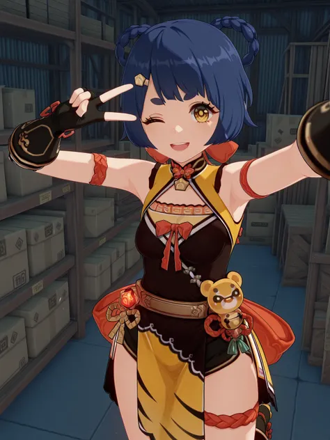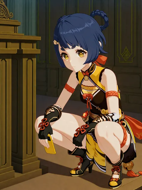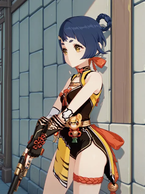 xiangling, xiangling (genshin impact), blue hair, braid, braided hair rings, hair ornament, hair rings, hairclip, yellow eyes, mature female, small breasts, 3darm strap, bare shoulders, bell, belt, black footwear, black gloves, boots, brown belt, cleavage, cleavage cutout, clothing cutout, dress, fingerless gloves, gloves, high heels, jingle bell, thigh strap,