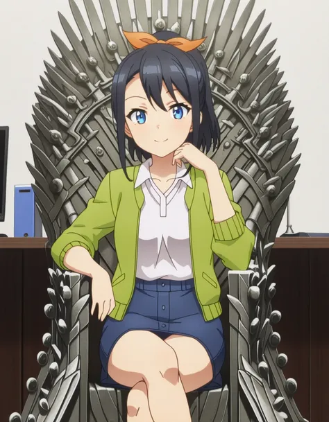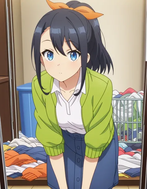 maika takatori, blue eyes, black hair, ribbon, hair ribbon, ponytail, medium hair, mature female, small breasts, anime screencapshirt, skirt, jacket, white shirt, open clothes, collared shirt, blue skirt, denim, green jacket