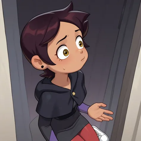 Luz Noceda, tan skinned, golden-brown eyes, dark brown hair, round black earrings, black capelet, black dress, black sash, multicolor sleeves, multicolor pantyhose, white loafer sneakers,