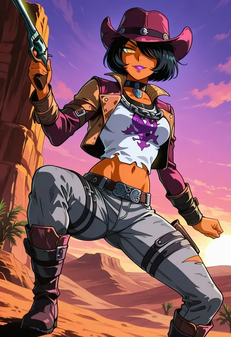 NishaBTPS, 1girl, solo, tanned skin, purple cowboy hat, black hair, bobcut, yellow eyes, hair over one eye, full lips, purple lipstick, choker, white torn shirt with print, brown jacket, large breasts, navel, midriff, groin, belt, grey denim pants, bandage, collar, chain, holster, boots, handgun, revolver,