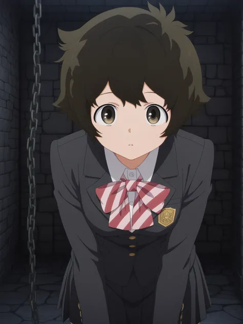 minoru ookuma, short hair, brown hair, black hair, brown eyes, anime screencap,skirt, long sleeves, jacket, black skirt, black jacket, blazer, bow, bowtie, stripped, stripped bowtie,