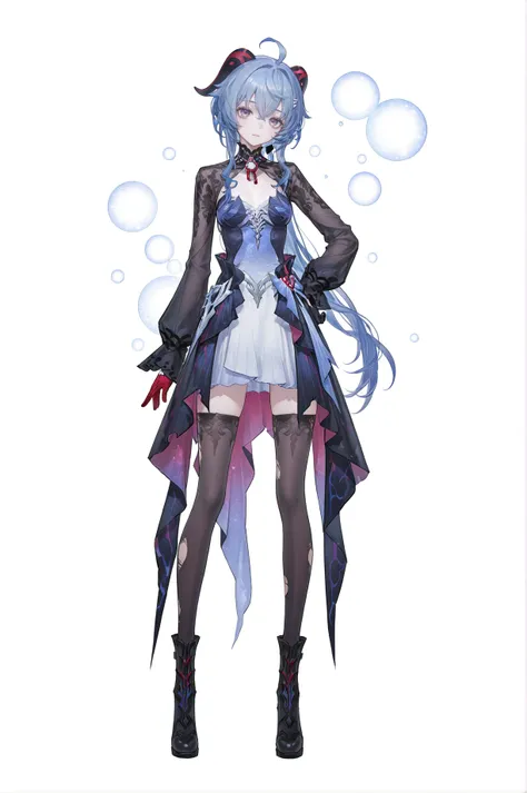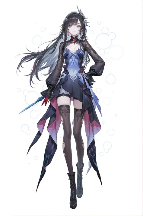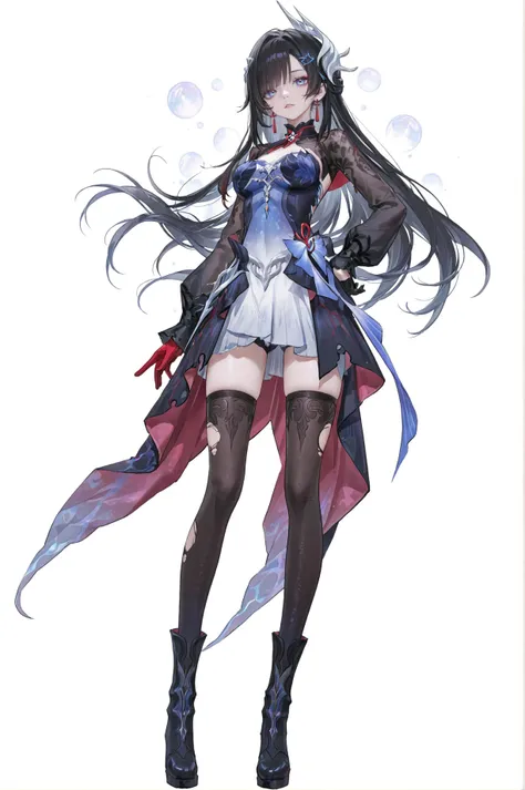 Hysilens \(Honkai: Star Rail\), silver face scale, 1girl, long hair, blue eyes, black hair, Hysilensdef hair ornament, bangs, breasts,clothes: Hysilensdef white-and-black dress, Hysilensdef thighhighs, Hysilensdef mismatched gloves, long sleeves,torn thighhighs,black left glove,red right glove